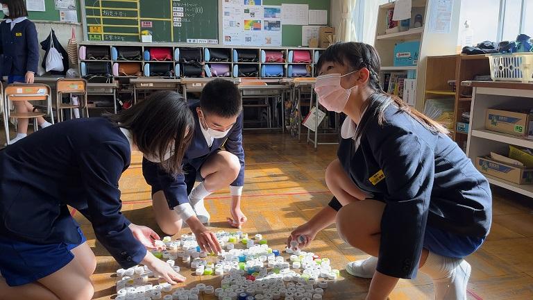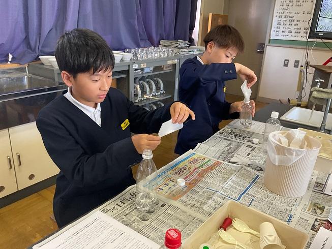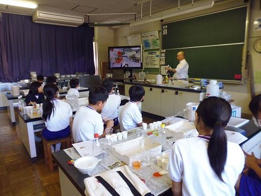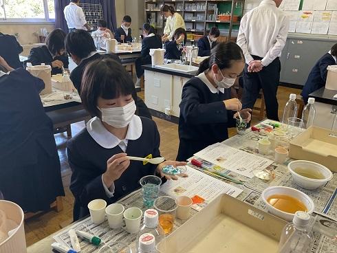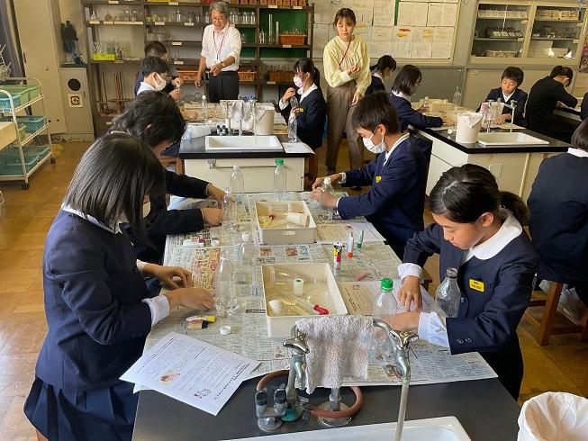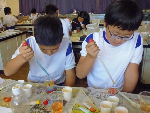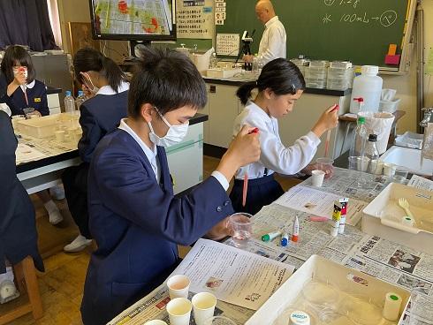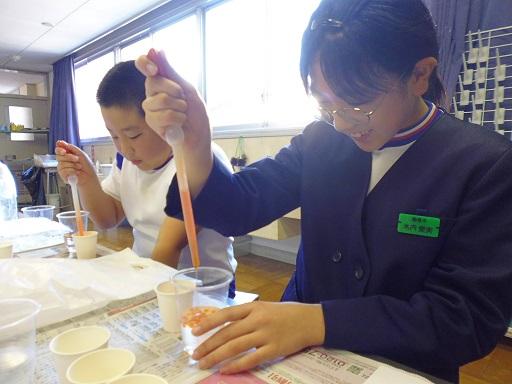 第1回に続き、講師として、木谷先生が来てくださいました。今回は「ゲル化の科学 人口イクラを作ってみよう」という課題で取り組みました。原料はアルギン酸ナトリウム(海藻の成分)や塩化カルシウムです。ペットボトルに入れ、キャップをしめて5分間強く振ることから始まりました。最後には、本物そっくりな「人口イクラ」が出来上がりました。そして、絵の具からお気に入りの3色を選び「色粒人口イクラ」を作りました。ペットボトルに入れると、すてきなインテリアが完成しました。ゲル化の不思議を感じられる体験となりました。