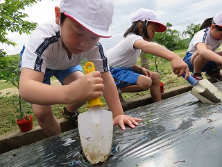 1・2年生は、学級園にミニトマトの苗植えをしました。これは、ふるさと教育の一つです。トマト農家の勝井先生から苗の植え方、美味しいトマトの育て方など教えていただきました。苗を丁寧に植えた後、最後にトマトの成長を願ってきれいな水と明るい歌声のシャワーをかけてあげました。今後は、収穫したトマトを使った簡単な料理も計画中です。