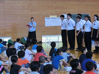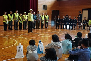 対面式では、警察署の方からは交通安全と防犯についてのお話があり、「いかのおすし」の確認をしました。次に、見守り隊代表の方から子ども達へのメッセージをいただきました。そして、児童を代表して6年生が、日頃の感謝とお礼の言葉をお伝えしました。 最後に、見守り隊の皆様と子ども達が地区同士で集まり自己紹介をして交流しました。見守り隊の皆様、今年度も51名の子ども達をよろしくお願い致します。