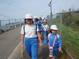 ふれあい遠足は、縦割り班で活動して異学年での交流をはかることと校区の自然と名所への関心を高めることがねらいです。 いぬわし・とき・つばめ・きじの4グループでは、6年生の上手なリードで全員が完歩しました。帰ってきた時の表情は、皆、達成感と満足感でいっぱいでした。