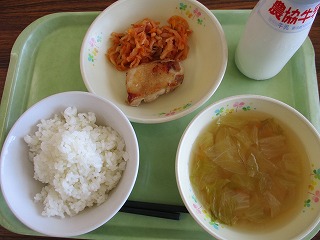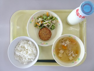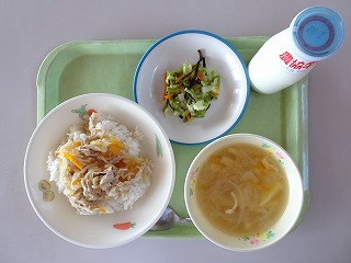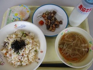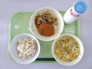 たきこみごはん、枝豆コロッケ、茎わかめのキンピラ、たまごスープ、牛乳