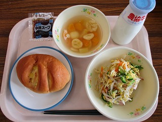 チーズパン、冷やし中華、フルーツ白玉、牛乳