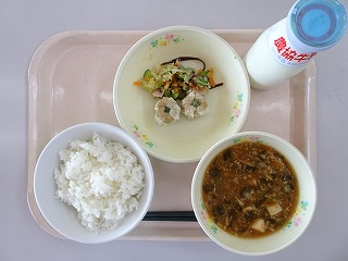 ごはん、シュウマイ、中華あえ、マーボー豆腐、牛乳