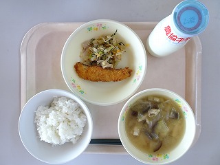 ごはん、とびうおのフライ、切り干しのぴりから炒め、みそ汁、牛乳