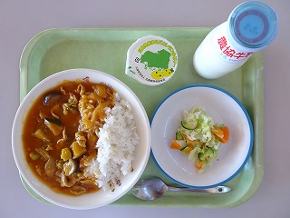 夏野菜カレー、浅漬け、まるごとレモンゼリー、牛乳