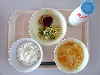 ごはん、ハンバーグ、きゅうりのピリ辛あえ、トマトと卵のスープ、牛乳