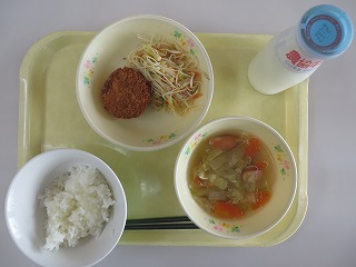 ごはん 焼きビーフン かぼちゃコロッケ ポトフ風スープ 牛乳