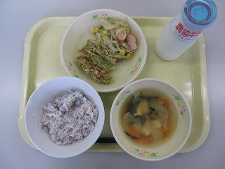 ゆかりご飯 ちくわの磯辺揚げ ウインナーソテー みそ汁 牛乳