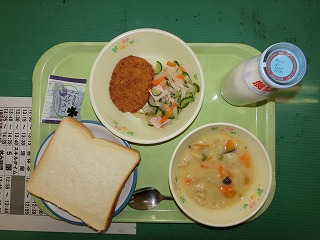 食パン パンプキンシチュー コロッケ 大根サラダ ジャム 牛乳