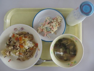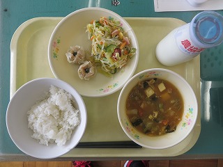 ごはん シューマイ 中華サラダ 豆腐のカレー煮 牛乳