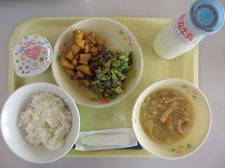 ごはん さつまいもと大豆のごま揚げ いそべあえ みそ汁 チョコプリン 牛乳