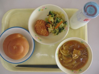 ミルクロール カレーうどん エビカツ サラダ 牛乳