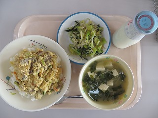 他人丼 みそ汁 からしあえ 牛乳