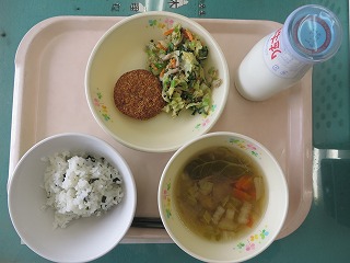 わかめごはん メンチカツ ごまあえ めった汁 牛乳