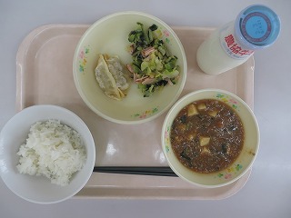 ごはん 焼きぎょうざ 海藻サラダ 麻婆豆腐 牛乳