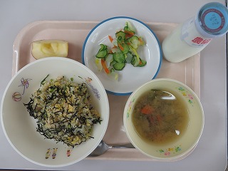 魚のそぼろどん みそ汁 浅漬け りんご 牛乳