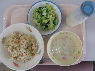 きゃべつとひき肉のチャーハン クラムチャウダー サラダ 牛乳