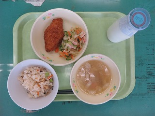 たきこみご飯 鮭のフライ 大根サラダ みそ汁 牛乳