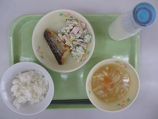 ごはん 焼き魚 マカロニサラダ みそ汁 牛乳