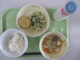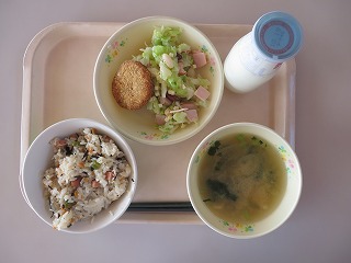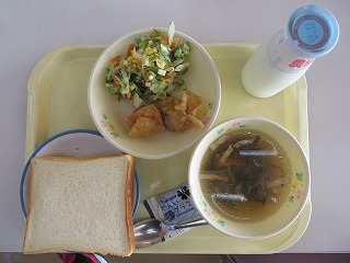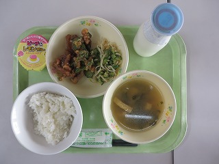 ごはん 豚肉のかりん揚げ ごま酢あえ みそ汁 ゼリー 牛乳