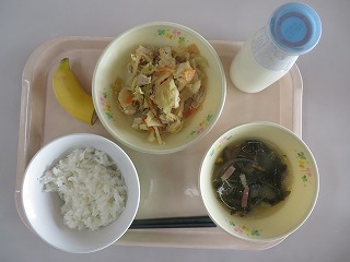 ごはん 豚肉と厚揚げのみそ炒め 中華スープ バナナ 牛乳