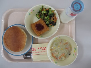 ミルク食パン 鶏肉のレモンソース サラダ 野菜スープ ジャム 牛乳