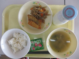 ごはん ふりかけ 魚のフライ 五目きんぴら みそ汁 牛乳
