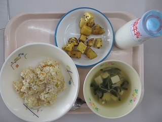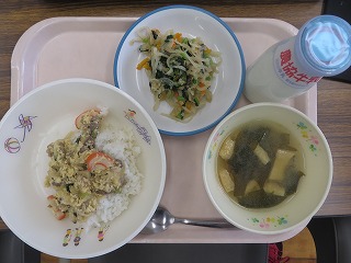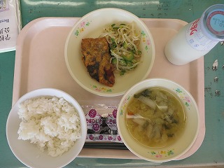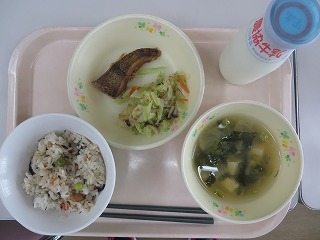ごはん 魚の磯辺揚げ ごま酢あえ みそ汁 佃煮 牛乳