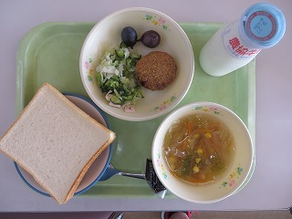 食パン メンチカツ サラダ コンソメスープ 巨峰 ジャム 牛乳
