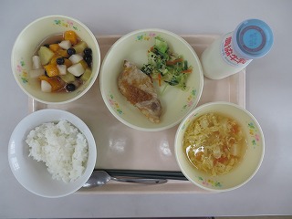 2017年10月3日 11時48分ごはん 豚肉のしょうが焼き おひたし トマトのスープ フルーツポンチ 牛乳