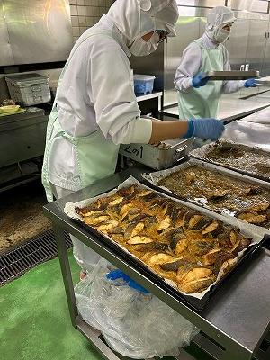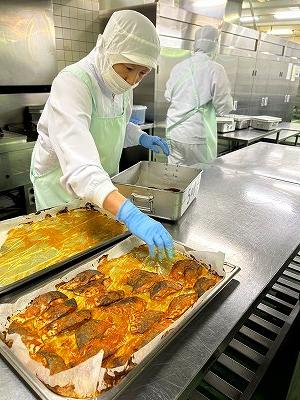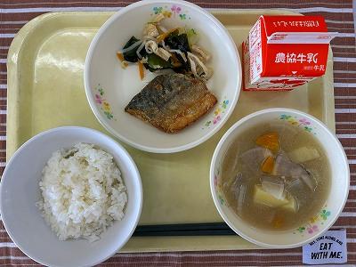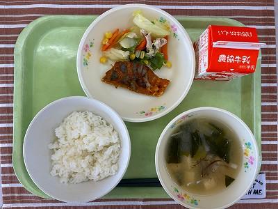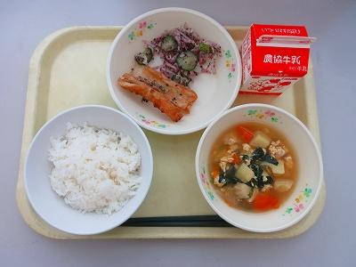今日の給食は和食献立です。給食では、月の半分は和食になるように献立を考えています。今日のさけは、にんにくやねぎを混ぜたみそダレに漬け込んで焼きました。