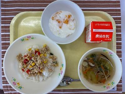 今日の給食は、タイ料理の「ガパオライス」です。鶏肉、豚肉、大豆ミート、ピーマン、パプリカ、コーンが入っています。本来はナンプラーを使用しますが、給食では「いしる」を使いました。最後にバジルを加え、夏にぴったりのさわやかな味に仕上がりました。