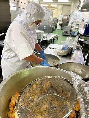 今日の主菜は、「さばのカレー揚げ」です。まんべんなく味がつくように、さばをしょうゆや酒、カレー粉で下味をつけ、米粉と片栗粉を合わせた衣をつけ揚げました。魚が苦手な子でもカレー味にすると食べやすいですね!