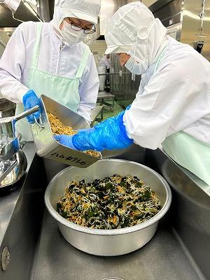 今日の副菜は、「野菜のしそあえ」です。写真では見えにくいですが、穴水町産の切干大根も入っています。ポリポリとした食感がよく、しその風味で暑い季節にぴったりの副菜です。