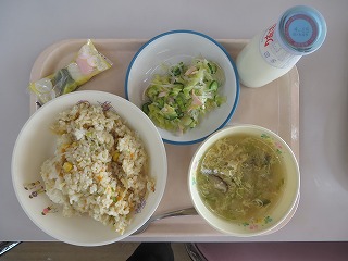 焼き豚チャーハン 中華スープ さっぱり中華風サラダ 牛乳