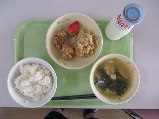 ごはん 鶏肉のカレー揚げ うの花 いちご みそ汁 牛乳