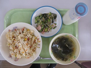 2017年4月19日 11時51分焼き豚チャーハン 中華スープ さっぱり中華風サラダ 牛乳