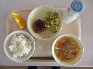 ごはん チキンカツ サラダ のっぺい汁 オレンジ 牛乳