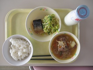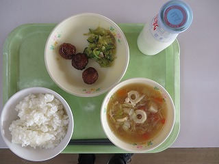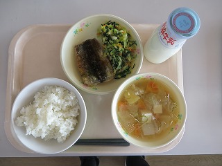 ごはん 魚の蒲焼き おひたし さつま汁 牛乳