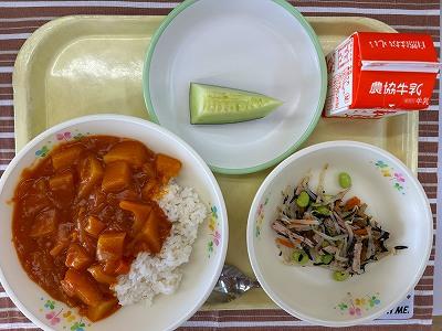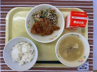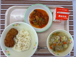 今日は、手作りのチキンカツです。衣に粉チーズとパセリを入れました。手作りのおいしさが感じられる仕上がりになりました。副菜は、「ラタトゥイユ」です。ラタトゥイユは、フランスの煮込み料理です。旬のなす、ズッキーニ、トマト、ピーマンをトマトソースで煮込みました。