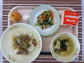 今日は牛丼です。たまねぎ、糸こんにゃく、ねぎ、牛肉が入っています。ごはんに合うように少し濃いめに味付けしました。丼のごはんは、昆布と日本酒を入れて炊いています。