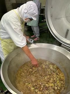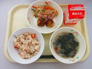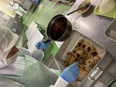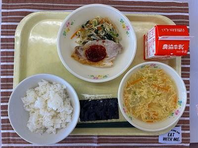 今日の給食は韓国料理です。中学生からの提案をヒントに、「サムギョプサル」を入れてみました。コチュジャンをベースにしたタレを作り焼いた豚肉にかけました。にんにくやごま油が入って、食欲をそそる味に仕上がりました。
