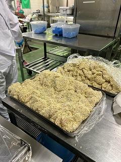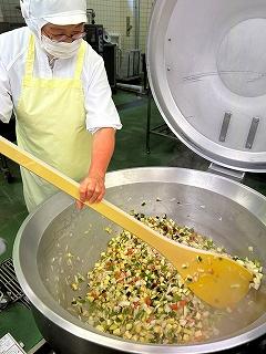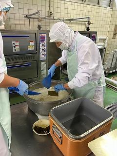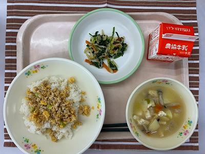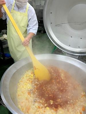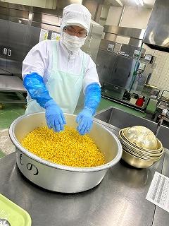 今日の給食は、そぼろ丼です。鶏ひき肉と豚ひき肉を使い、たまねぎと合わせてそぼろを作ります。炒り卵は、「スチームコンベクションオーブン」という機械で作りました。ごはんによく合う味に仕上がっています。