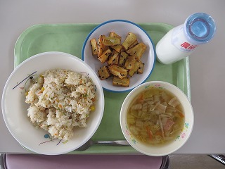シーチキンチャーハン 五目スープ 大学芋 牛乳