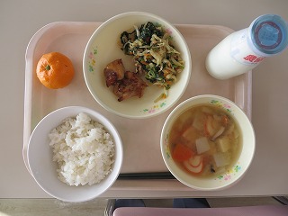 ごはん 鶏肉のてりやき 切り干し大根のピリ辛炒め いものこ汁 みかん 牛乳
