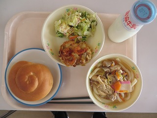 2017年1月25日 14時08分ごはん ハムチーズピカタ 白和え 野菜のかす汁 ワッフル 牛乳