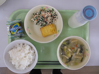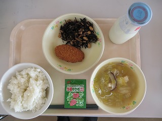 ごはん コーンフライ ひじきの煮物 みそ汁 ふりかけ 牛乳
