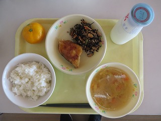ごはん さごしの唐揚げ ひじきの煮物 みそ汁 みかん 牛乳
