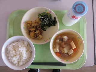 ごはん さつまいもと大豆のごまあげ しらすあえ おでん風煮 牛乳
