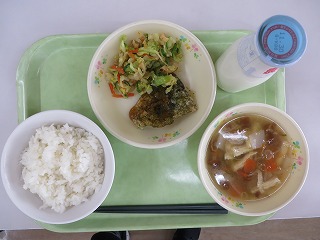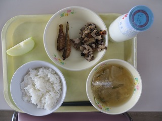 ごはん はたはたの唐揚げ れんこんのきんぴら みそ汁 りんご 牛乳